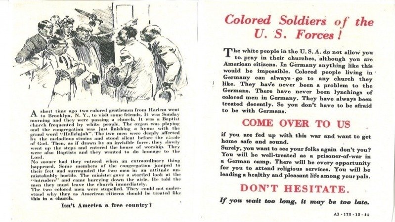 During World War II, German propagandists were well aware of widespread racism in the United States and in the US Army, as shown by this Nazi leaflet aimed at Black soldiers. Their goal was not to convert Black Americans to Nazism, but rather to convince them to desert or surrender. Nazi racial ideology considered Black people a racially inferior threat to so-called "Aryan" society, but these views were not printed in leaflets like this one.