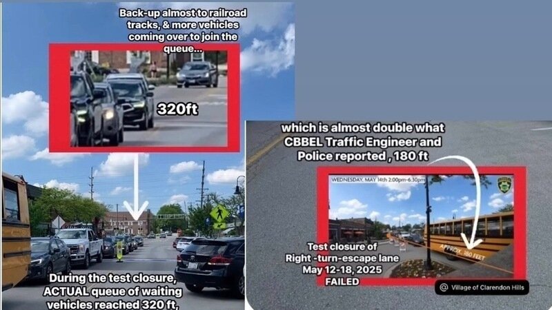 Did you know the ACTUAL backup was almost to the railroad tracks at 320 feet, NOT 180 ft as reported by the Traffic Engineer on 6/12/25. Can you PLEASE SHARE this information with at least one neighbor today? This image clearly shows the reported vs ACTUAL backup that occurred on May 14, 2025, during the "test closure" of the southbound right-turn-escape-slip-fork lane in Clarendon Hills. And this will occur with a bus (40 second wait) or even with a single pedestrian who will make the full crossing from coffee store to triangle to Wasabi (also 40 seconds, with only one vehicle advancing between the two crossings.)