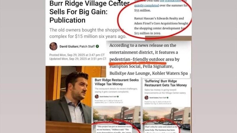 Burr Ridge Center developers, the ones who eliminated storefront parking and made a drastic change to BR's downtown traffic pattern only to make way for another plaza, quietly sold out this summer and cleared $40M...leaving the Village of Burr Ridge and its businesses with the after-effects.