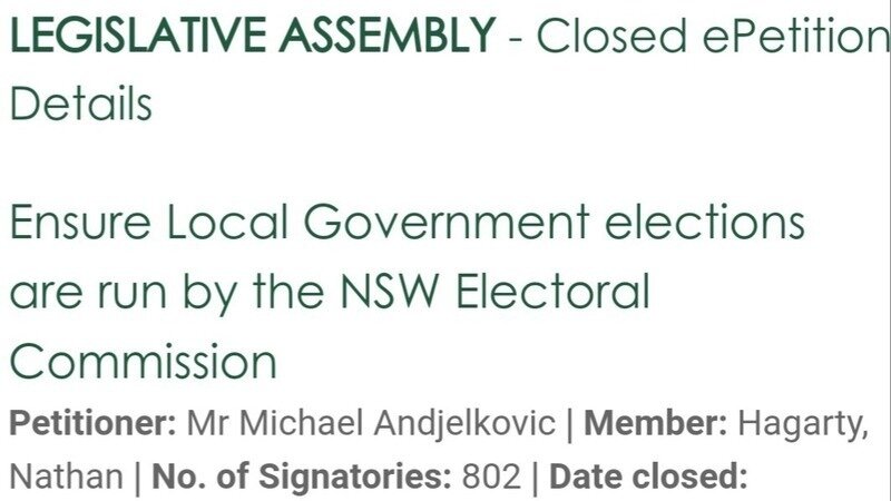 "To the Speaker and Members of the Legislative Assembly, This petition of the residents of New South Wales brings to the attention of the House the decision of the previous NSW State government to allow Local Councils to engage the services of private providers instead of the NSW Electoral Commission to conduct elections. Currently three Councils have opted to engage private companies to run their Local Government elections being Fairfield, Liverpool and Penrith Councils. Liverpool Council was the most recent Council that voted to dump the NSW Electoral Commission from running the Local Government election at its 1st March 2023 Council Meeting held in a Confidential Session. The undersigned petitioners ask the Legislative Assembly call on the Government to mandate the use of the NSW Electoral Commission to oversee all Local Government elections from September 2024 in order to maintain and ensure voter confidence and provide full transparency in the election process."