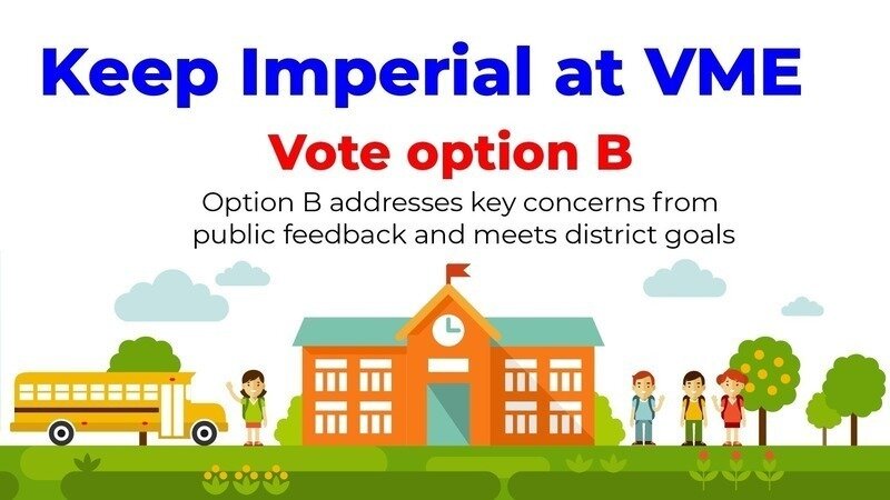 - Option B, the new proposal, which keeps Imperial zoned to Veterans Memorial Elementary (VME), which is our current zone, and where we would like to remain zoned.