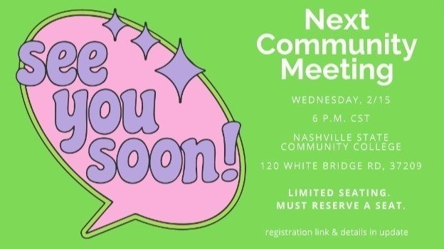 - Registration is open for the Wednesday, 2/15 community meeting at Nashville State at 6 pm CST. A livestream will also be available. (You MUST register for this one).