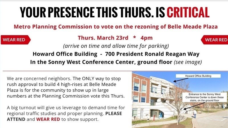 This Thursday, March 23 at 4 pm the proposed rezoning of Belle Meade Plaza goes in front of the Planning Commission. All the details are provided in the image.