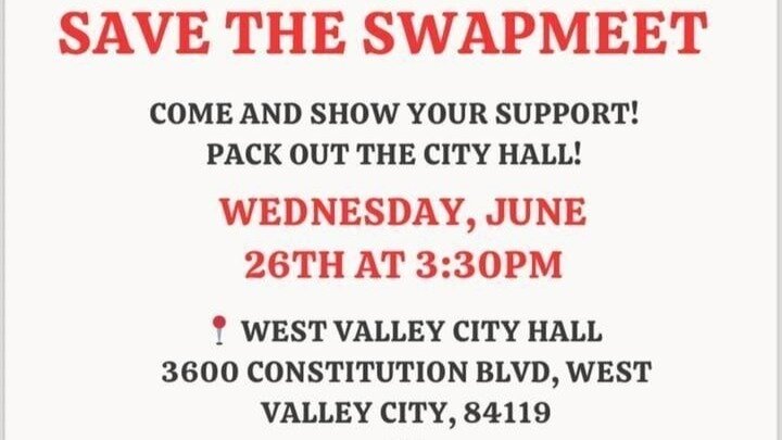 A Save the Swapmeet event is happening on Wednesday, June 26th at 3:30 PM at West Valley City Hall. The event aims to gather support and oppose the rezone.