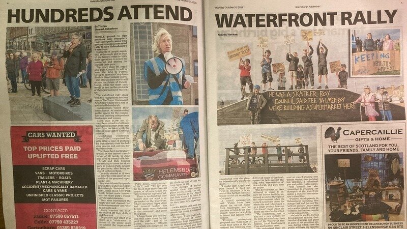 The Helensburgh Advertiser also has a fantastic double page spread on the rally and the campaign to stop the supermarket in this week's edition. We've included a picture, but you can read it for yourself here.