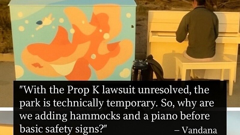 With the Prop K lawsuit still unresolved, Sunset Dunes Park is technically temporary. So why do we have hammocks, a piano, and a decorative phone booth, before basic safety signs?
