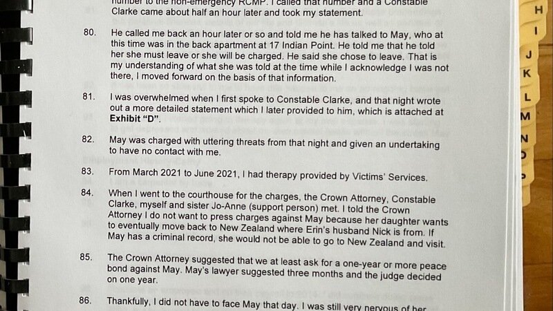 When I questioned Constable Clarke on the stand, I presented him first with a copy of the UNDERTAKING he had drafted on the night Cathy falsely accused me of abuse and threats. He acknowledged that he had never forced me out of my home and that as stated in the UNDERTAKING, I was allowed to remain in the home as Cathy Bennett stated that she was staying in the boathouse. I then presented Constable Clarke with Cathy’s Affidavit at section #80, to which he stated, “I would not have said that”, and he further elaborated that it was the responsibility of Victim Services to provide Cathy with the UNDERTAKING. Evidence has come forward proving that Victim’s Service did explain to Cathy and did provide her with the UNDERTAKING shortly after she had given statements to the RCMP on January 2-3, 2021.