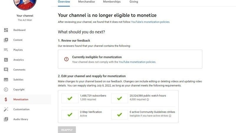 It's official everyone. YouTube has decided to go against ALL logic and demonetize The Act Man's channel. Adding insult to injury you can even see in the image above that he's channel is in complete compliance and can't even rectify any alleged mistakes to reapply.