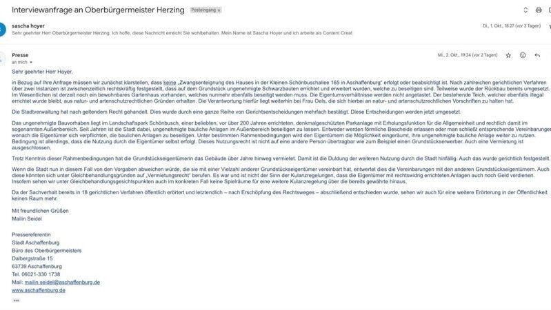 in Bezug auf Ihre Anfrage müssen wir zunächst klarstellen, dass keine „Zwangsenteignung des Hauses in der Kleinen Schönbuschallee 165 in Aschaffenburg“ erfolgt oder beabsichtigt ist."