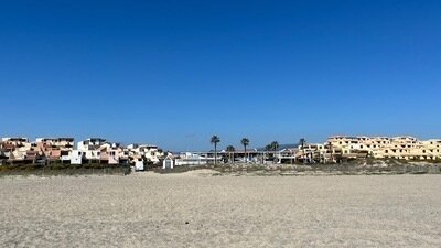 La photo est prise depuis la plage. On y voit que chacun des bâtiments qui constitue le complexe de l’Hacienda est bâti en harmonie avec les résidences voisines : toits en tuile et 1 seul étage.