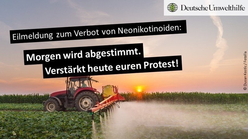 Liebe Unterstützer/innen! Morgen treffen sich die Vertreter/innen der EU-Mitgliedsstaaten, um über ein Verbot von Neonikotinoiden abzustimmen. Das ist unsere Chance! Julia Klöckner muss unbedingt für ein Verbot stimmen! Schreibt ihr heute noch eure persönliche Protestmail, damit sie die richtige Entscheidung für Deutschland und für die Bienen trifft: www.duh.de/bienen