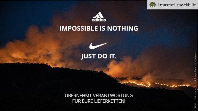 Liebe Unterstützer:innen, für das Leder in unseren Schuhen gehen tagtäglich riesige Waldflächen Südamerikas in Flammen auf. Statt Verantwortung zu übernehmen, verstecken sich die beiden Marktgiganten Adidas und Nike hinter skrupellosen Zulieferern, die für die Produktion des Leders Brandrodung, Landraub und moderne Sklaverei in Kauf nehmen! Schreibt jetzt eine Protestmail an die CEOs von Adidas und Nike und fordert sie auf ihre Lieferketten transparent zu machen!