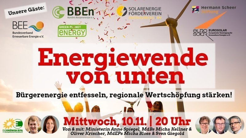 der Ausbau der Erneuerbaren Energie in Deutschland ist mächtig ins Stocken geraten. Um die Klimaziele zu erreichen, müssen wir dringend und unkompliziert grünen Strom ankurbeln. Die Bürgerenergie - also lokale grüne Energie aus dezentralen Wind- und Solaranlagen auf Dächern und Freiflächen - ist ein Schlüssel zur Energiewende. Denn regionale grüne Energie erlaubt es uns allen, an der Energiewende teilzuhaben. Die Kommunen verdienen einen größeren Anteil an der Wertschöpfung. Bürgerinnen und Bürger und Unternehmen aus der Region sollten als Investoren weiterhin zum Zuge kommen, um die Energiewende wieder zu beschleunigen.