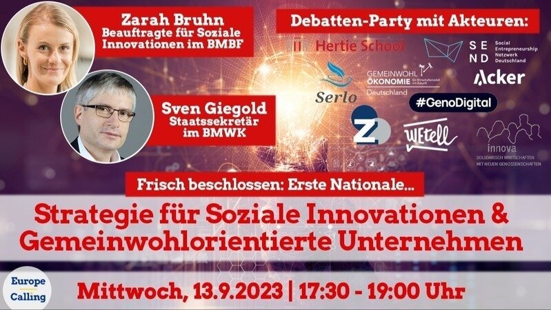 Am Mittwoch (13.9.) beschließt die Bundesregierung die erste Strategie überhaupt für Soziale Innovationen und Gemeinwohlorientierte Unternehmen. Gemeinsam mit Zarah Bruhn (BMBF) komme ich exklusiv zu Europe Calling ins Webinar und stelle mich den Fragen der Akteur*innen und Bürger*innen. Hier anmelden: https://t1p.de/ehgu6