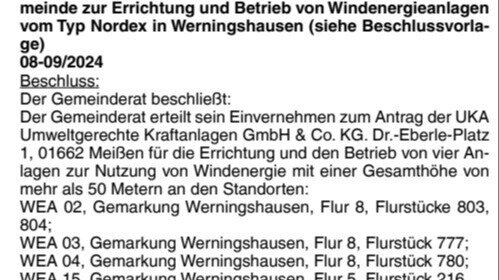 folgend die Fragen zur Einwohnerversammlung zum Windpark am 13.06.25 in Werningshausen:
