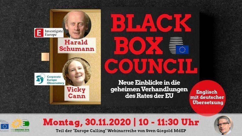 am Sonntag veröffentlicht das Journalistenkonsortium „Investigate Europe“ seine neuesten Rechercheergebnisse über die eklatante Intransparenz innerhalb des Rates der Europäischen Union. Am Montag wird Harald Schumann, leitender Journalist von Investigate Europe, die Ergebnisse in unserem öffentlichen Webinar vorstellen.