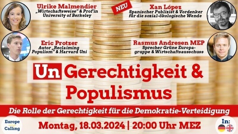 Welche Rolle spielt wirtschaftliche Ungerechtigkeit beim Erstarken des Populismus? Zu dieser zentralen Frage lädt Europe Calling e.V. zum nächsten Webinar. Mit Top-Gästen wie der deutschen “Wirtschaftsweisen” Ulrike Malmendier und dem kanadischen Autor Eric Protzer. Anmeldung möglich hier: https://t1p.de/k3ele