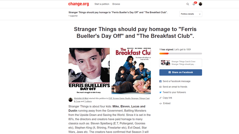 To those of you who have signed my Petition. I created another Petition. Here it is: https://www.change.org/p/stranger-things-cast-crew-stranger-things-should-pay-homage-to-ferris-bueller-s-day-off-and-the-breakfast-club. Please check it out, read it and sign it.