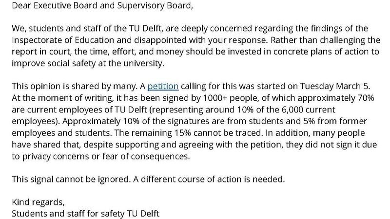 Mise à jour sur la pétitionStudents and employees of TU Delft disagree with the official response to OI reportPetition presented to board TU Delft