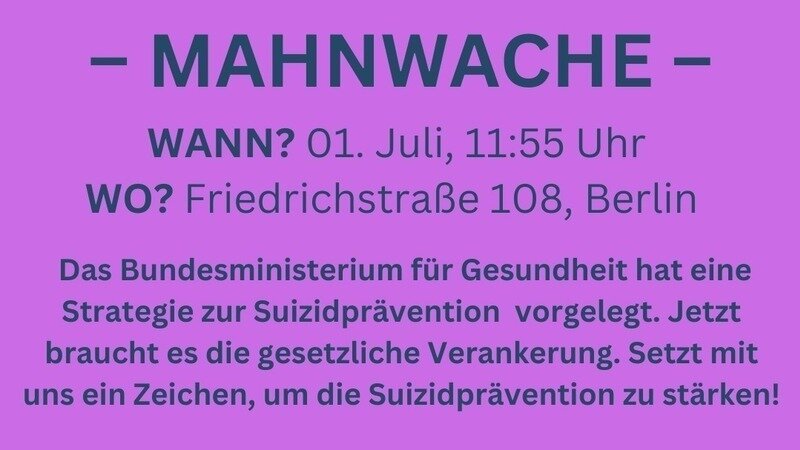 Wir laden Sie am 01.07.2024, 11.55 Uhr zu einer Mahnwache vor dem Gebäude des Bundesgesundheitsministeriums in der Friedrichstrasse 108 in Berlin ein. Gemeinsam mit Ihnen möchten wir den Bundesgesundheitsminister an den Auftrag erinnern, bis zum 30.06.2024 einen Gesetzentwurf vorzulegen und damit auch die gesamtgesellschaftliche Bedeutung dieses Themas nochmals zu unterstreichen.