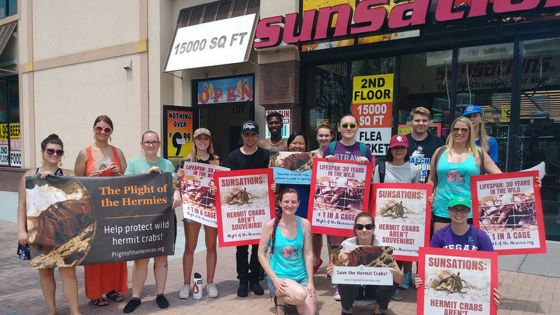 Last weekend, volunteers spoke up for imperiled wild hermit crabs by protesting once again at Sunsations -- this time at 25th St in Virginia Beach! As we peacefully held signs, we could see crabs languishing right inside in cramped, crowded conditions. Help them TODAY by leaving a polite but firm Facebook message for the company: bit.ly/msgSunsations!