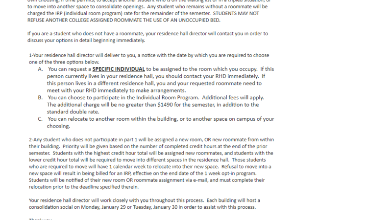On January 26th, 2018, assistant director of SUNY Oneonta's Residential Community Life Mike Farmer sent out a mass e-mail to students living on campus that anyone who does not have a roommate has three options:
