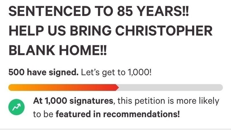 We are so thankful for the overwhelming amount of support shown for our cause. With your help we can make a change that is long overdue…together we can bring Christopher Blank home!! Please continue to share our petition. Our next milestone to hit is 1000 signatures…with your help I know we can make that happen.