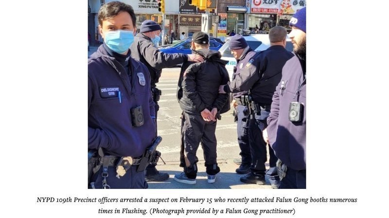 (Minghui.org) Officers from the New York City Police Department (NYPD) 109th Precinct arrested a suspect in Flushing, New York on February 15 for repeatedly attacking Falun Gong informational booths. Buqiu Zheng appeared at the Queens Criminal Court on February 16 and was charged with two Class E felonies: Criminal Mischief in the Fourth Degree and a hate crime.