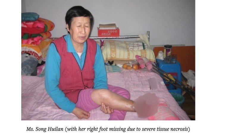 The police put Ms. Song in a forced labor camp in 2002. After she was released three years later, she had to leave home to avoid further persecution. She was arrested again in 2011 and held in a detention center. The guards injected her with unknown drugs, which caused severe tissue necrosis that led to the loss of her right foot and rendered her left leg barely functional.