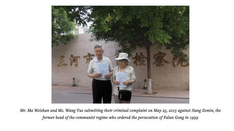 Ms. Wang Yue was a retired teacher in Sanhe City, Hebei Province. Her husband, Mr. Ma Weishan, was arrested on April 22, 2014 for sending text messages about Falun Gong. He was sentenced to a five-year term by the Sanhe City Court on November 5, 2015. The Langfang City Intermediate Court rejected his appeal on May 13, 2016.