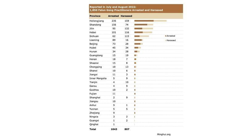 (Minghui.org) Another 1,850 incidents of Falun Gong practitioners being arrested or harassed for their faith were confirmed in July and August 2022.