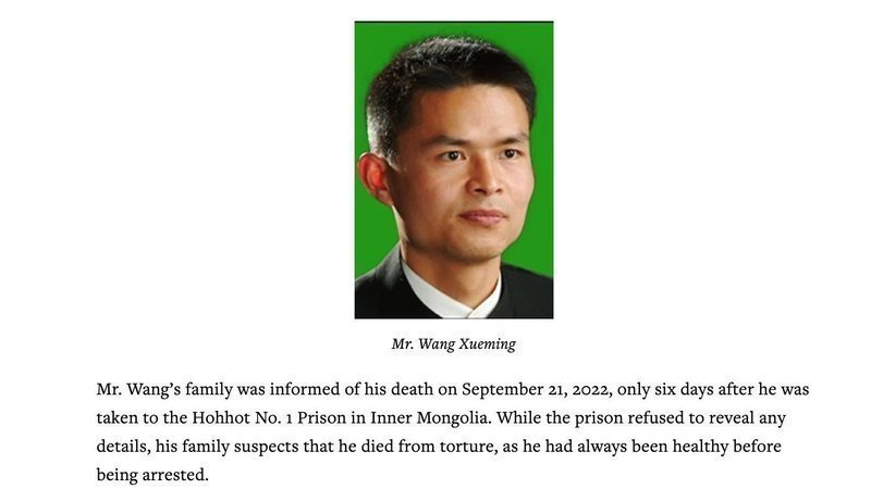 Mr. Wang’s family was informed of his death on September 21, 2022, only six days after he was taken to the Hohhot No. 1 Prison in Inner Mongolia. While the prison refused to reveal any details, his family suspects that he died from torture, as he had always been healthy before being arrested.