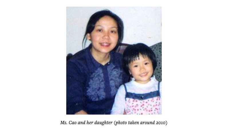 Ms. Cao was arrested again on July 5, 2010 with her daughter and held at a brainwashing center.