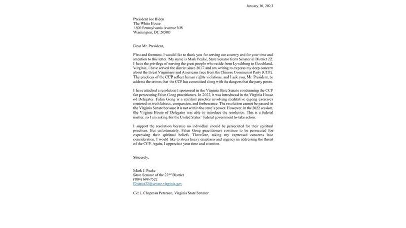 (Minghui.org) Senator Mark Peake and Senator Chapman Petersen of Virginia wrote to President Joe Biden on January 30 calling on him to take action against the persecution of Falun Gong in China. Senator Peake represents District 22 and Senator Petersen represents District 34.
