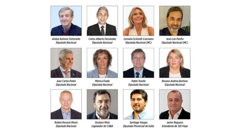 The ten Members of the Congress of the Argentine Nation: Adriana Noemí Ruarte (not pictured), Aníbal Antonio Tortoriello, Carlos Alberto Fernández, Cornelia Schmidt-Liermann (MC), José Luis Patiño (MC), Juan Carlos Polini, Mónica Frade, Pablo Torello, Rosana Andrea Bertone, and Rubén Manzi.