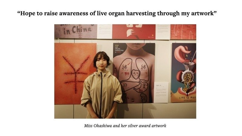 Miss Ohashiwa, who designed the silver award poster, “Reserved,” is an art student at a university in Sapporo. She said that, when she was creating her poster, she researched information about live organ harvesting and was heartbroken to find out that even children do not escape this evil. So she decided to use the theme of a child who represents the future of the country to expose the cruelty of live organ harvesting. She herself researched and verified the prices of the organs marked on the poster. The check marks in red and the specific dates show that the organs have been reserved, sending home the message that live organ harvesting is very real and very cruel.