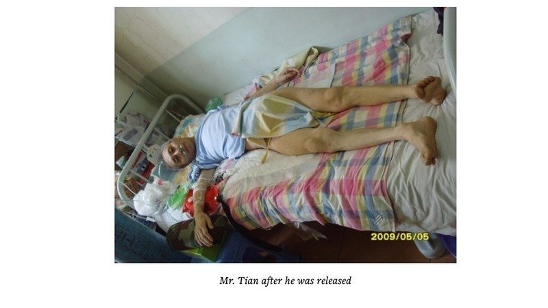 Due to the torture, Mr. Tian became emaciated and was unconscious most of the time. Yet the police still attempted to take him to the Suihua Forced Labor Camp. While performing a physical examination on Mr. Tian, they forcibly tied his hands and feet. After the labor camp doctors noted that all of his organs were failing, they refused to admit him. After 48 days of torture, Mr. Tian was released on the brink of death. His family was also extorted for 2,000 yuan.