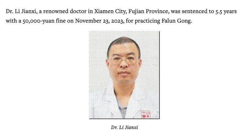 Dr. Li Jianxi, a renowned doctor in Xiamen City, Fujian Province, was sentenced to 5.5 years with a 50,000-yuan fine on November 23, 2023, for practicing Falun Gong.