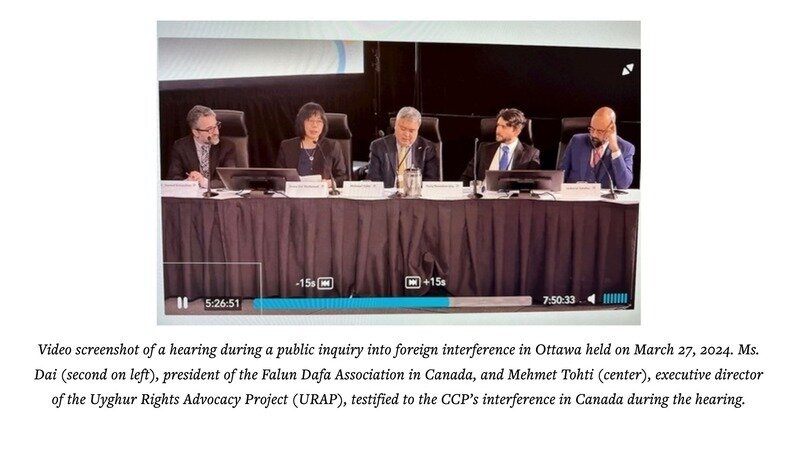 The Falun Dafa Association in Canada published a 130-page report in October 2023 titled “Foreign Interference & Repression of Falun Gong in Canada” that exposed the CCP’s foreign interference and transnational repression targeting the Falun Gong community in Canada over the past two decades. Ms. Dai summarized parts of the report during the hearing.