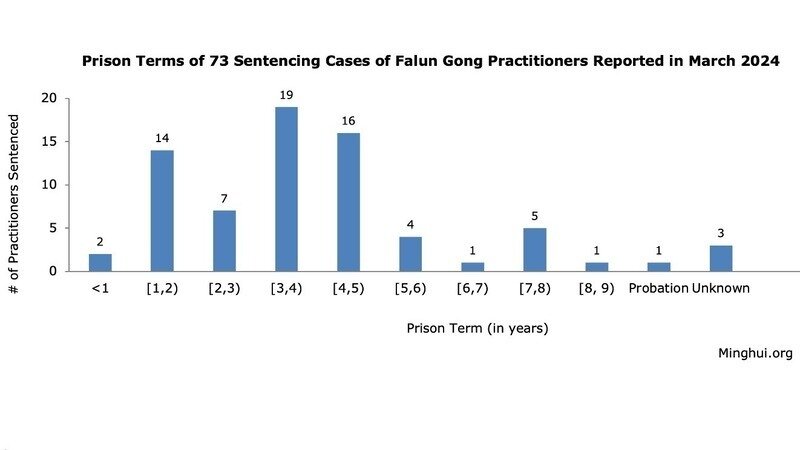 (Minghui.org) According to information collected by Minghui.org, 73 cases of Falun Gong practitioners sentenced for their faith were reported in March 2024.