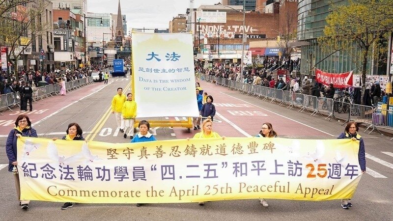 (Minghui.org) Over 2,000 Falun Dafa practitioners held a grand march in Flushing, New York on April 21 to commemorate the peaceful appeal in Beijing 25 years ago. They also celebrated the nearly 430 million Chinese people who quit the Chinese Communist Party (CCP) organizations.