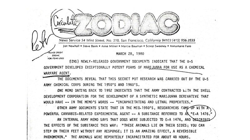 In March 1980, a radical press outlet called ZODIAC News Service released files showing that the U.S. Army, Big Pharma contractors, and intelligence-linked firms spent the 1950s and 60s developing “exceptionally potent” cannabis-based chemical warfare agents.