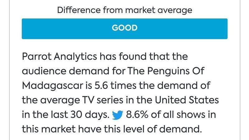 On a rolling 30-day average basis, comparing TV demand in the United States for The Penguins Of Madagascar to the preceding 30 days: Demand has increased by 14.5% (13.7% Previous)! 6.3x better than average (5.6x previous). Check live info here: