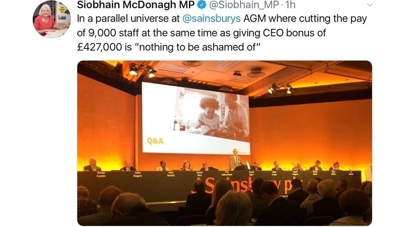 She says "I've misunderstood the definition of 'fairness' because whilst Sainsbury's have scrapped the bonus scheme for their shopfloor staff they've astonishingly awarded an eye watering bonus of £427,000 to CEO Mike Coupe." She goes on to describe a meeting with Sainsbury's senior staff: "I was most astonished to hear that the most longstanding colleagues losing thousands of pounds per year described as 'anomalies'".