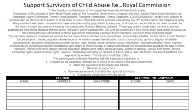 The petition of the citizens of New South Wales calls on the Australian Government to support Survivor Justice Rights Now! Survivors are Aboriginal Stolen Generation, Former Child Migrants, Forgotten Australians, Forced Adoptions, LGBTIQPNSGDA+ people born outside of wedlock who as children were placed in institutions or some other form of out-of-home care during the 20th century and is still happening today. Many survivors who seek compensation have been silenced by gag orders. Inadequate, to almost no compensation has been received by Survivors through any avenue including the complicated National Redress Scheme. These gag orders create legal barriers to prevent perpetrators from being charged with the crime. Survivors get threatened with 100-year jail sentences if they break these gag orders to speak up. The community gets prevented by these gag orders from being educated to prevent these injustices from happening again.