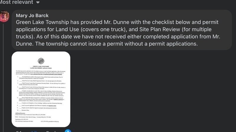 "Green Lake Township has provided Mr. Dunne with the checklist below and permit applications for Land Use (covers one truck), and Site Plan Review (for multiple trucks). As of this date, we have not received either completed application from Mr. Dunne. The township cannot issue a permit without a permit application."