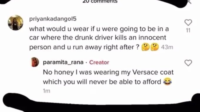 She came out with an apology after 2 weeks and changed her username to Paramita2.0 saying that incident changed her life. Here, she tried to empathise with Leela's family saying she lost her father on a car accident as well and and blamed her fleeing on her mental health saying she was mentally unstable. Then on her recent TikTok where she was asked about what she would wear on such a day she said "Versace which you can never afford" She is someone who is still being signed by major labels of Nepal.