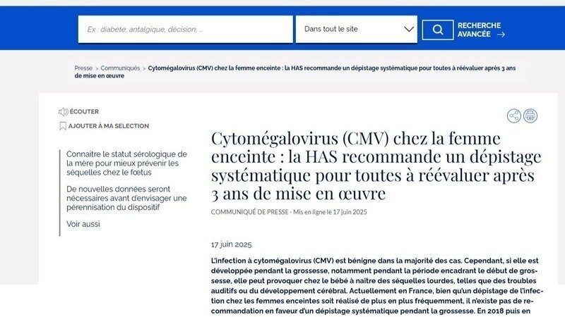 Nous avons le plaisir de vous annoncer que la Haute Autorité de Santé a émis ses recommandations en faveur du dépistage systématique précoce du CMV chez les femmes enceintes.