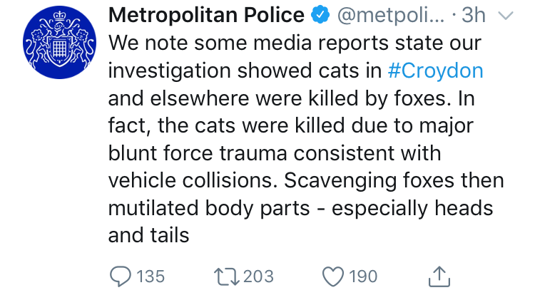 They are trying to blame cars and foxes!!! “There is no evidence of human involvement” oh yes because we all forgot that cars and foxes can neatly cut off cats heads and tails then go and place the body parts together on the owners doorstep! Translation “we still have NO clue who’s behind it so let’s blame foxes” sounds like they’re trying to find reasons to make a fox cull happen. People in the comments have said foxes were also killed by this murderer and another said her pet rabbit was killed by this PERSON as no fox could cut her rabbits head of so neatly and place its intestines in a triangle next to it! When this investigation started a vet quickly ruled out animal attack as the cats were killed with a sharp-bladed instrument. So unless you’ve seen foxes carrying sharp weapons it wasn’t them, stop trying to turn foxes into these evil creatures when their not stop blaming them for everything and find the real HUMAN murderer you’re making yourselves look like brainless idiots. And these are the professionals? They can’t even catch someone who’s been at large for three years, no wonder people don’t trust the police. LAZY! WE CAN’T ALLOW THEM TO LET THIS PERSON CARRY ON! SIGN AND SHARE PLEASE!