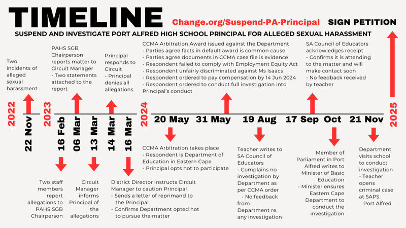 Petition updateSuspend and Investigate Port Alfred High School Principal for Alleged Sexual HarassmentTimeline Infographic: Alleged Sexual Harassment by PAHS School Principal